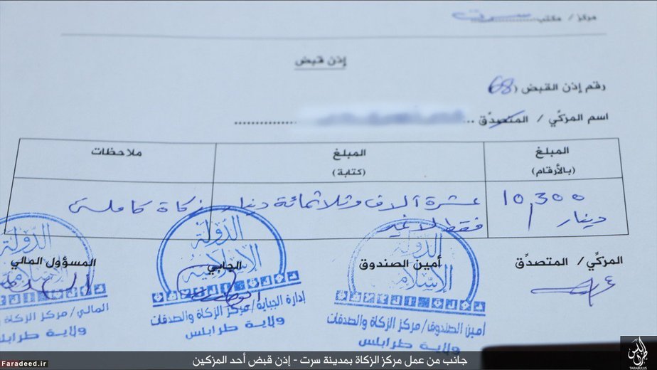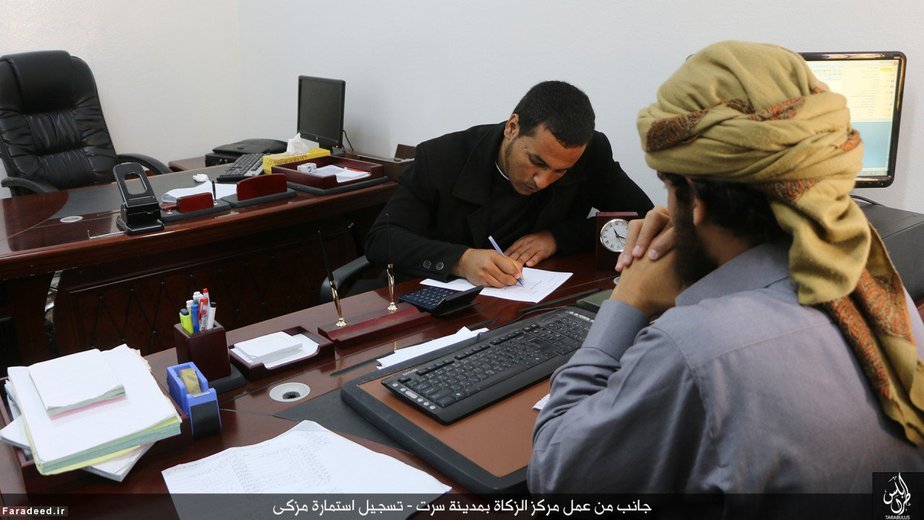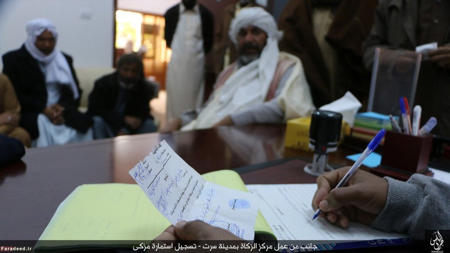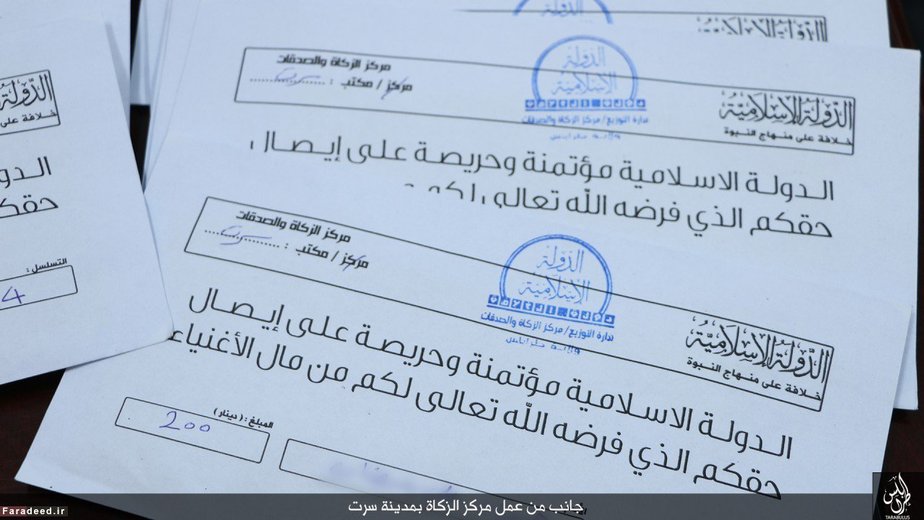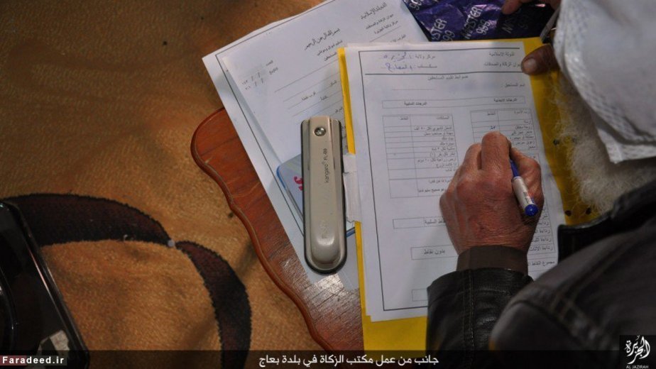 به گزارش فرادید، این تصاویر نشان می دهد شهروندان مناطق اشغالی در استان صلاح الدین عراق با مراجعه به دیوان "زکات" مجبور به پرداخت بخشی از درآمد خود به داعش هستند. داعش مدعی است با خرید مایحتاج روزانه درآمد حاصل از کمک مردمی را بین افراد فقیر توزیع می کند. گفتنی است گروه تروریستی "داعش" که در سال 2014 میلادی پس از جداشدن از القاعده و گروه های تندروی سلفی به رهبری ابوبکر البغدادی اعلام موجودیت کرد در سالهای اخیر با حمله به شهرهای مختلف عراق و سوریه هزاران شهروند عراقی و سوری را کشته و آواره کرده است.