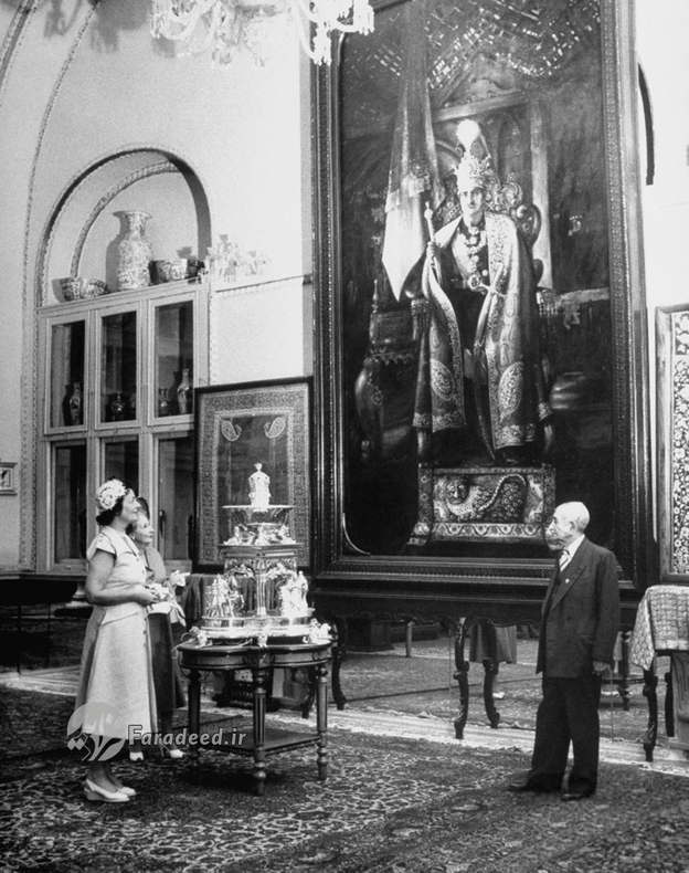 "مارین ویتنی هریمن"همسر فرستاده ایالات متحده در مقابل تصویر رضاشاه پهلوی در جریان گشت و گذار در کاخ سلطنتی در نیاوران