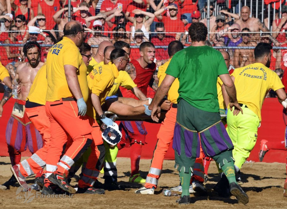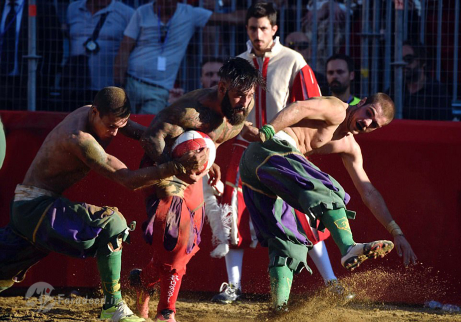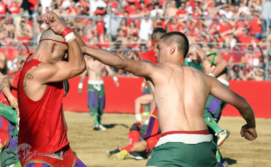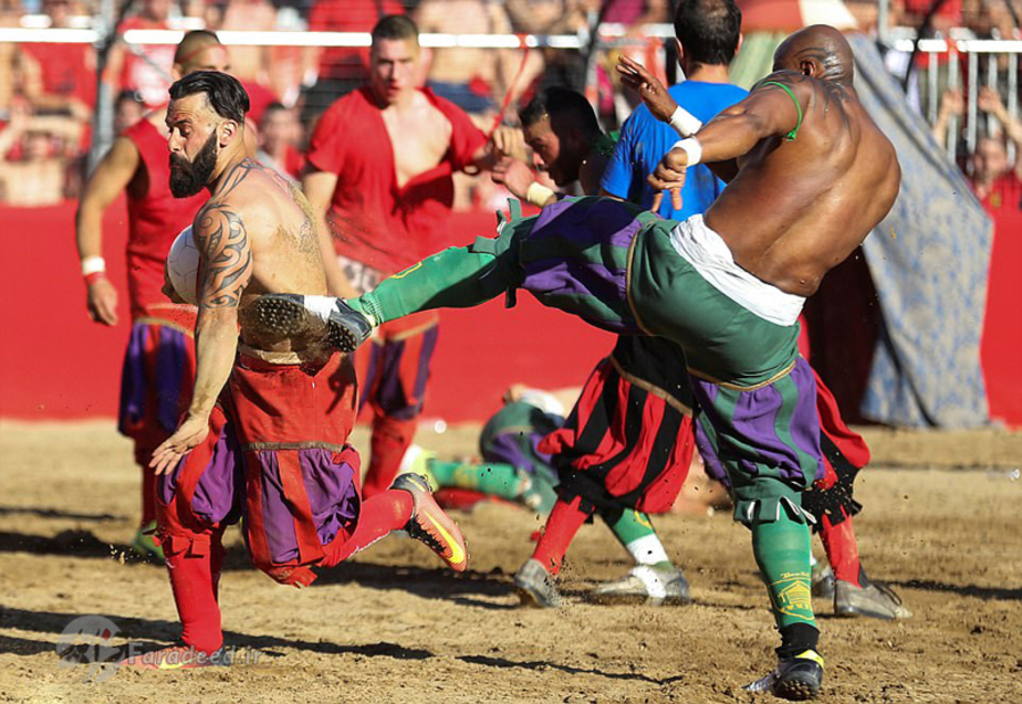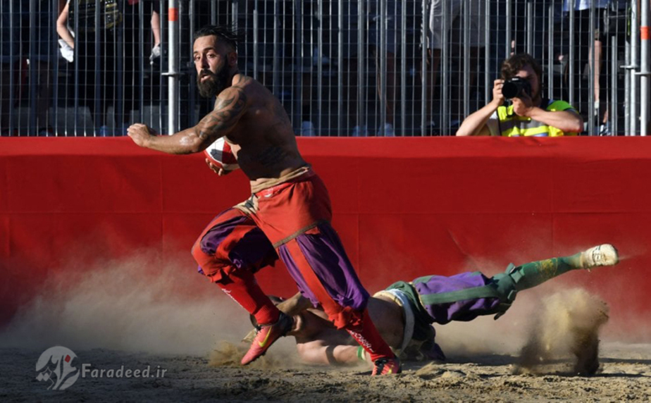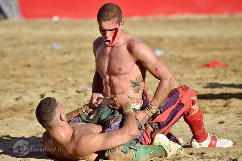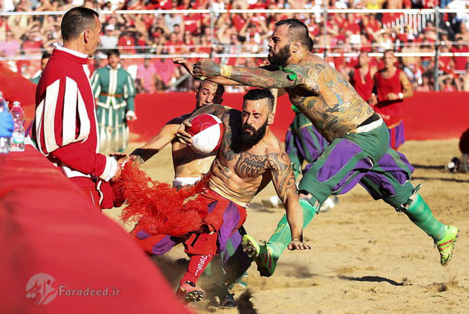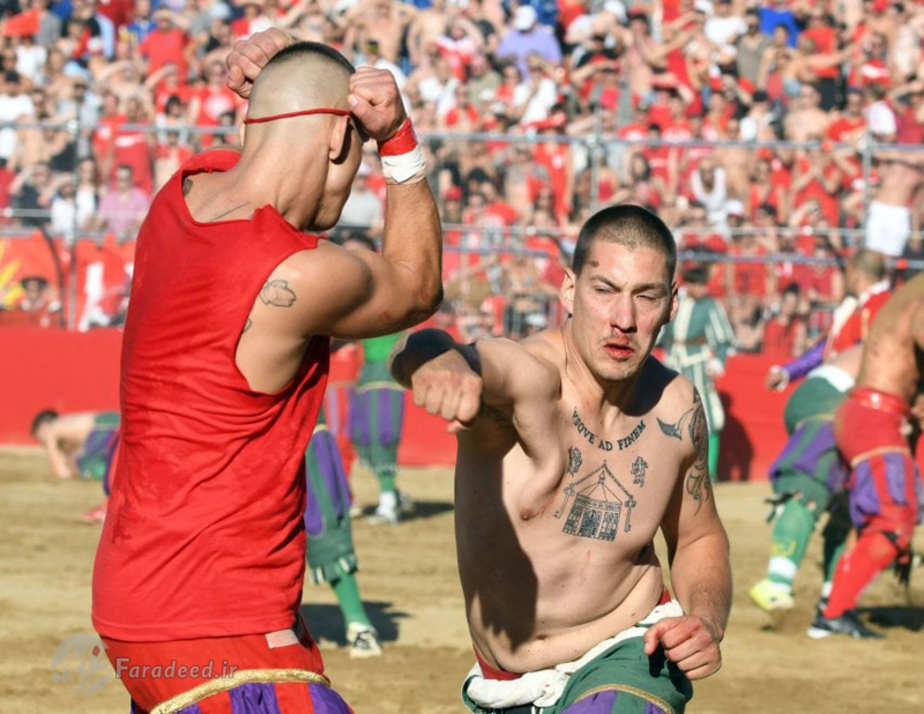 به گزارش فرادید، این فوتبالیست ها که از کمر به بالا برهنه هستند و بدنشان پوشیده از تاتوست در تیم های 27 نفره برای زدن گل از مشت، لگد و هر کار خشن دیگری استفاده میکنند. در حقیقت این فوتبالیست ها، بازیکنان یک فوتبال تاریخی به نام "کالیسیو استوریکو" هستند؛ یک بازی فوتبال که از سال 1574 میلادی، هر سال یکبار در شهر فلورانس ایتالیا برگزار می شود.