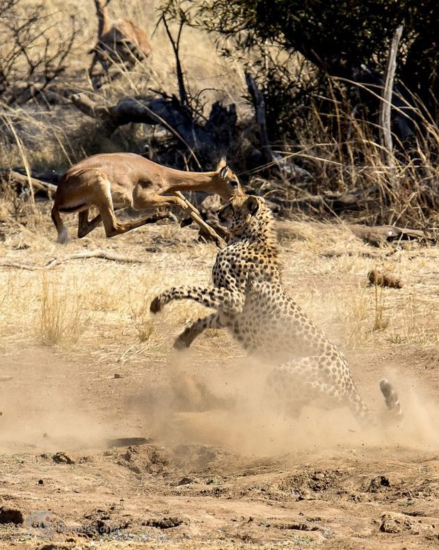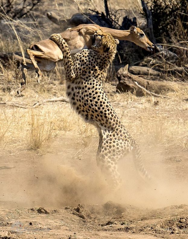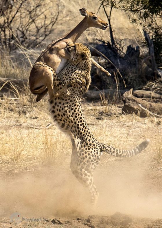 به گزارش فرادید، "دئون هوون" عکاس حیات وحش در پارک ملی "پیلانسبرگ" در افریقای جنوبی مشغول عکاسی بود که موفق شد لحظه نبرد مرگ و زندگی یوزپلنگ و آهو را ثبت کند.