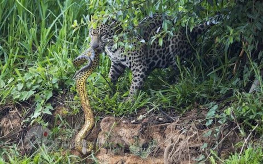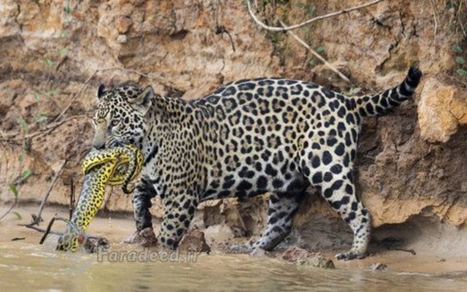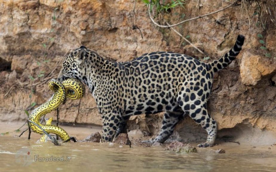 فرادید | یک عکاس حیات وحش در منطقه حفاظت شده در امریکا جنوبی نبرد نادر یک پلنگ جگوار با مار زرد آناکوندا را عکاسی کرد.
