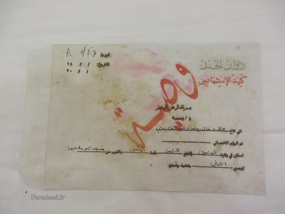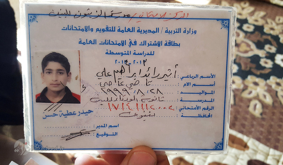 نامه فوق را یک دانشآموز به نام "اعلا عبد الاکیدی" پیش از خروج از مجموعه و انجام عملیات انتحاری علیه نیروهای امنیتی عراق در سال گذشته نوشته است.
