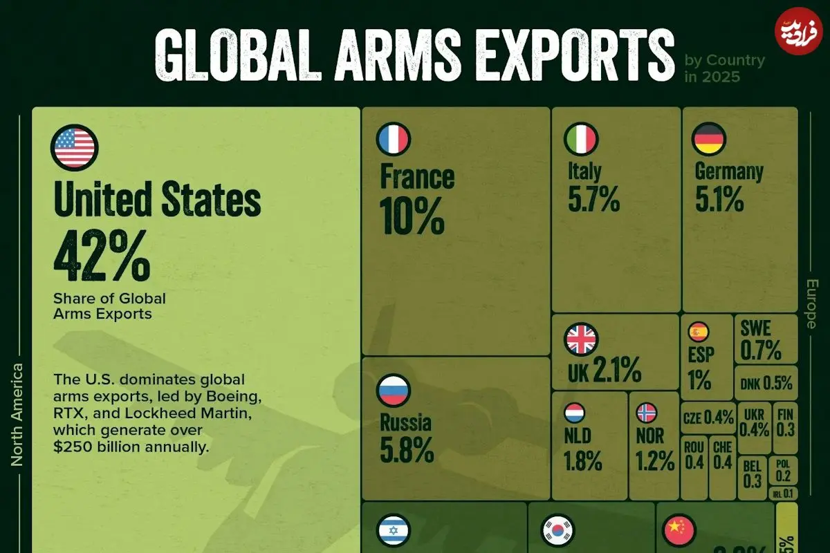 ایالات متحده در سال ۲۰۲۵ حدود ۴۲ درصد از صادرات جهانی تسلیحات نظامی را در اختیار داشته؛ رقمی که بیش از چهار برابر سهم ۱۰ درصدی فرانسه در جایگاه دوم است.