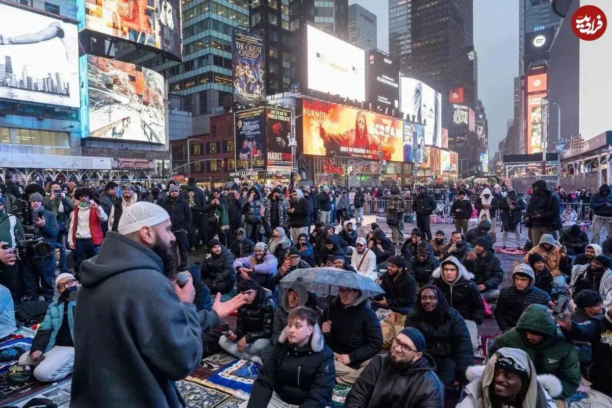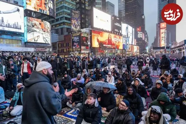 مسلمانان در میدان تایمز نیویورک در صف نماز ماه رمضان حاضر شدند. این تصویر نمادی از حضور و زندگی مسلمانان در یکی از شلوغترین نقاط جهان است.