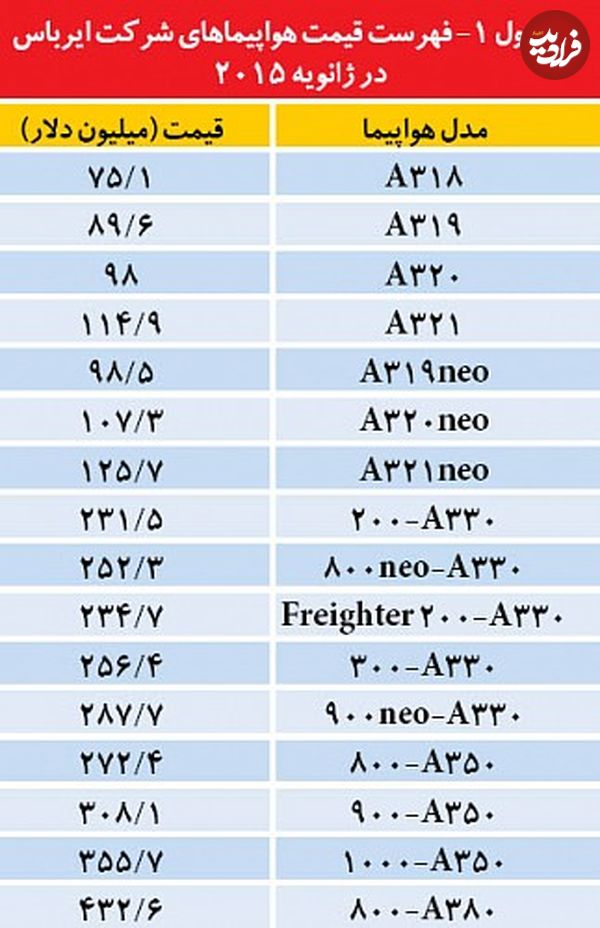 جدول شماره یک فهرست قیمت مدلهای مختلف ایرباس را در ژانویه 2015 نشان میدهد.