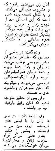 در فروردین ۱۳۵۹ سخنگوی دایره مبارزه با منکرات دادستانی انقلاب اسلامی به مدیران اماکن عمومی تهران هشدار که در صورت رعایت نکردن شئونات دستگیر و به دادگاه معرفی خواهند شد.