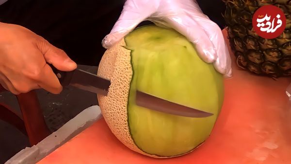 ببینید| هنرنمایی میوه فروش کره ای در برش زدن هندوانه، آناناس و طالبی
