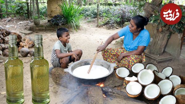 ببینید| غذای روستایی در سریلانکا؛ تهیه روغن نارگیل خالص توسط بانوی روستایی