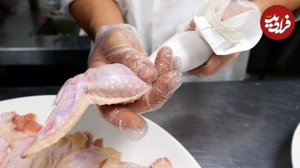 ببینید| غذای خیابانی در آمریکا؛ بال مرغ سوخاری پر شده با میگو در نیویورک