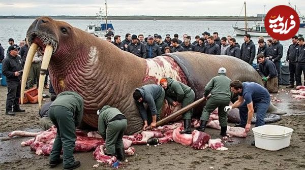 ببینید| شکار یک گراز دریایی بزرگ و برش زدن آن توسط ساکنان قطب شمال
