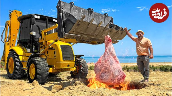 ببینید| غذای روستایی در آذربایجان؛ کباب ران بزرگ گاو با کمک لودر در روستا