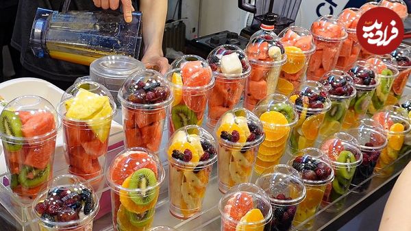 ببینید| برش ماهرانه کیوی، گریپ فروت، آناناس و دیگر میوه ها و تهیه آبمیوه با آنها در کره