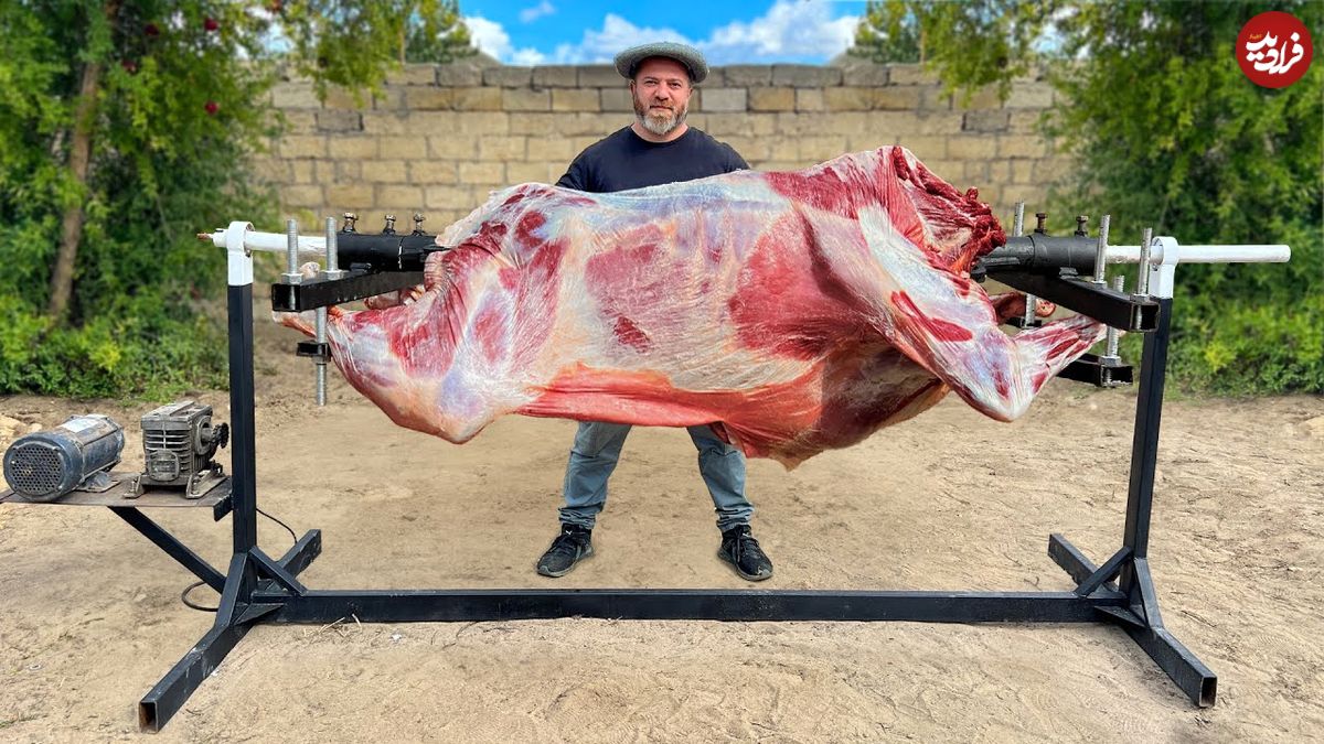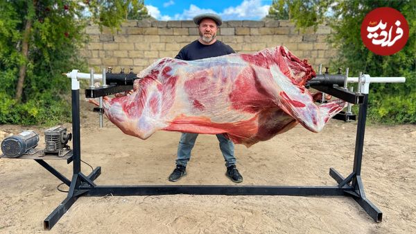 ببینید| غذای روستایی در آذربایجان؛ کباب گاو کامل روی آتش در روستا