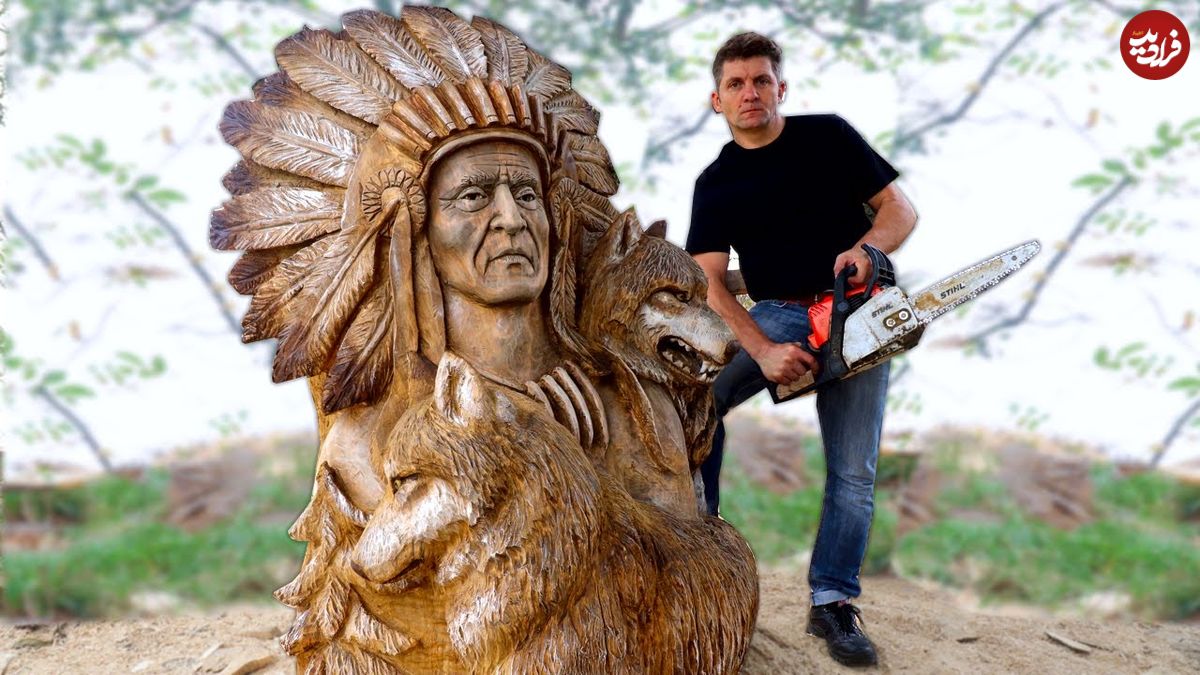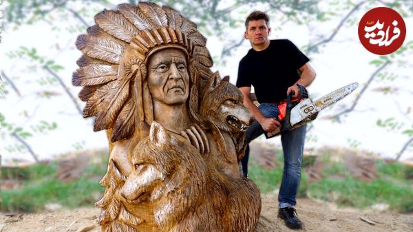 ببینید| فرآیند ساخت مجسمه چوبی یک «سرخ پوست با گرگ» با کمک اره برقی