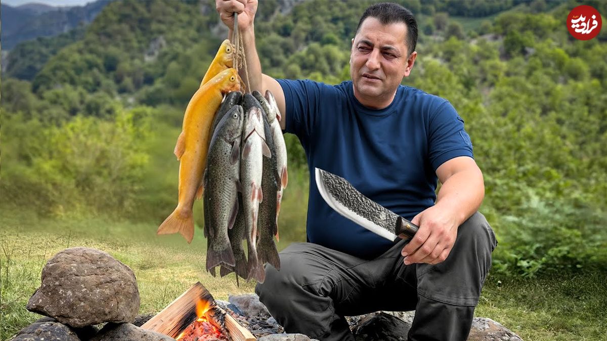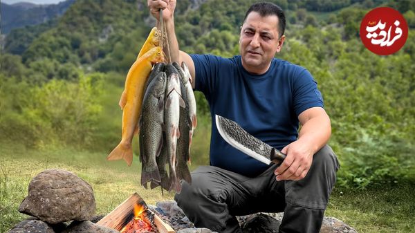 ببینید| غذای روستایی در آذربایجان؛ صید قزل آلا و کباب کردن آن روی سنگ