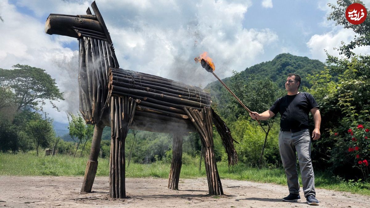 در این ویدئو یک آشپز باذوق آذربایجانی را در روستایی زیبا می بینید که پس از ساخت یک کباب پز شبیه اسب تروا، داخل آن گوشت را کباب می کند.