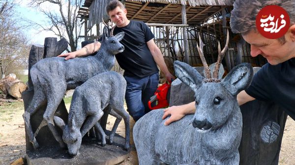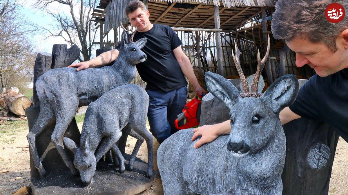 ببنیید| فرآیند ساخت مجسمه های چوبی گوزن در اندازه واقعی با اره برقی