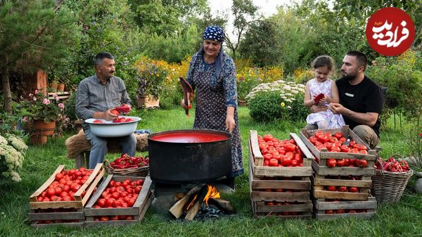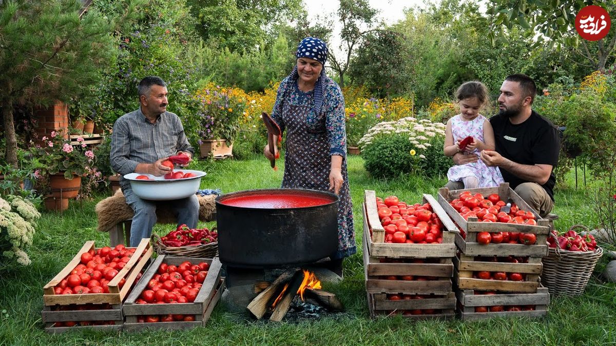ببینید| غذای روستایی در آذربایجان؛ تهیه رب گوجه به روش سنتی