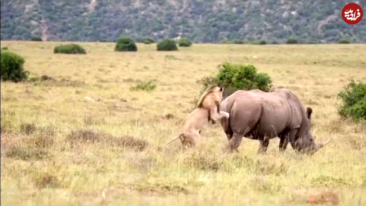 ببینید| تلاش یک شیر شجاع برای شکار کرگدن 2 تنی!
