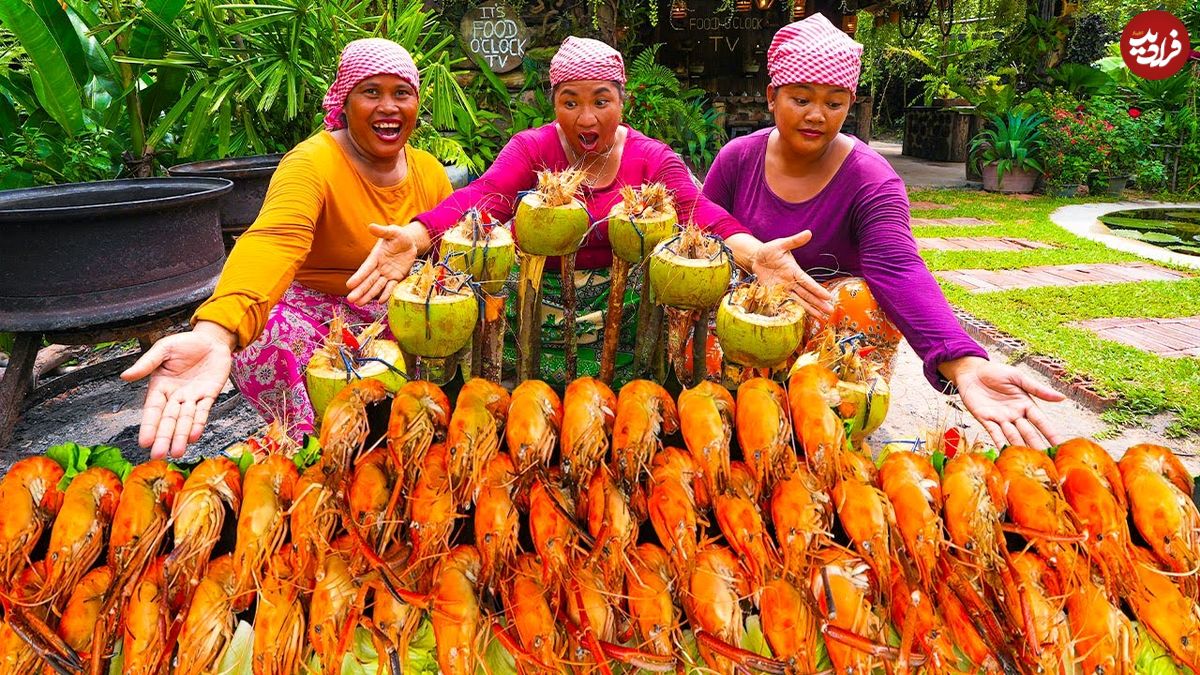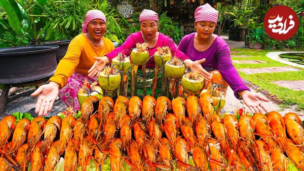 ببینید| غذای روستایی در سنگاپور؛ پخت غذا با میگو و سبزیجات در نارگیل روی آتش