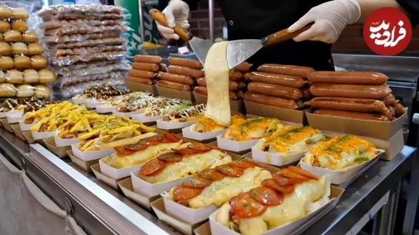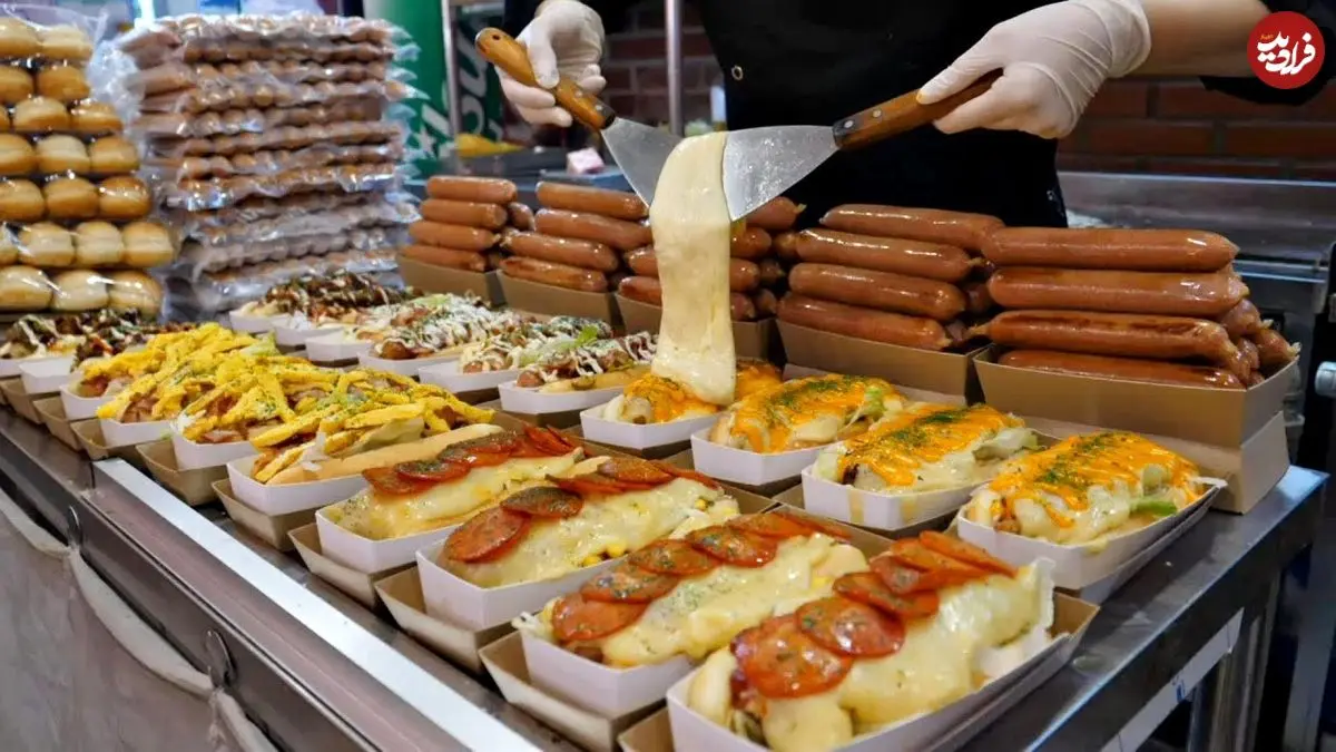 ببینید| غذای خیابانی در کره؛ هات داگ آمریکایی با پنیر و سس در سئول