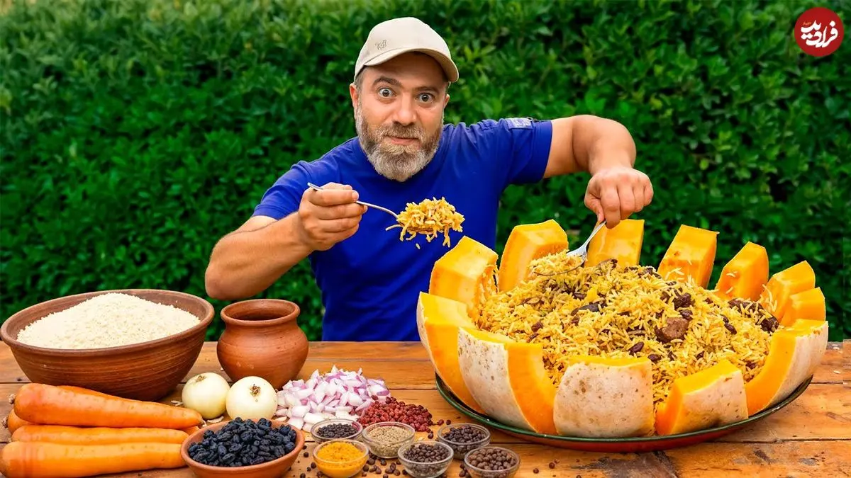 ببینید| غذای روستایی در آذربایجان؛ پخت ازبکی پلو و گوشت بره در دل کدو تنبل