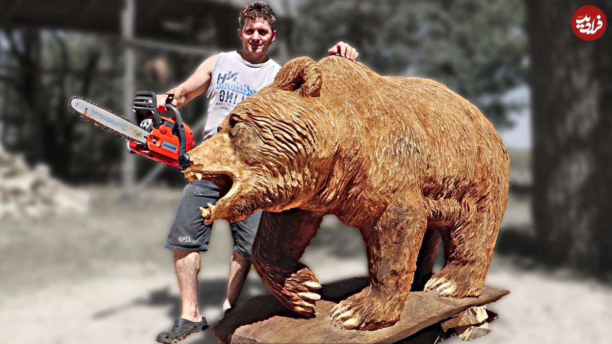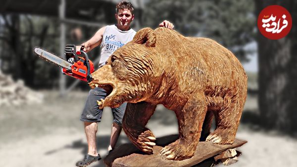 ببینید| مراحل دیدنی ساخت مجسمه خرس گریزلی چوبی در اندازه واقعی با اره برقی