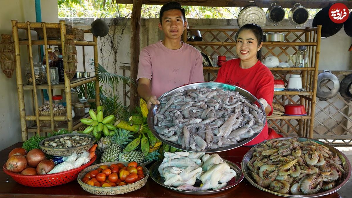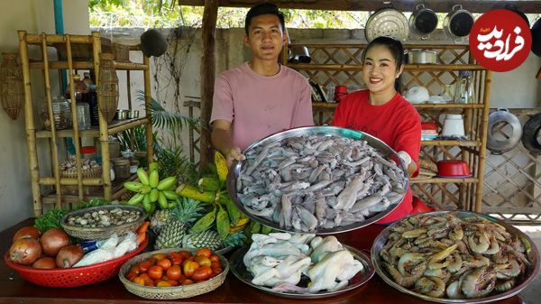 ببینید| غذای روستایی در چین؛ پخت غذا با ماهی مرکب، میگو و آناناس توسط خواهر و برادر روستایی
