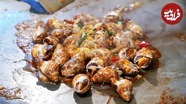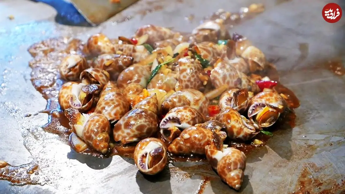 ببینید| غذای خیابانی در تایوان؛ حلزون دریایی سرخ شده با سبزیجات در تایپه