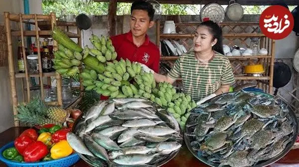 ببینید| غذای روستایی در چین؛ پخت یک غذای متفاوت با خرچنگ آبی، ماهی ماکرل و موز