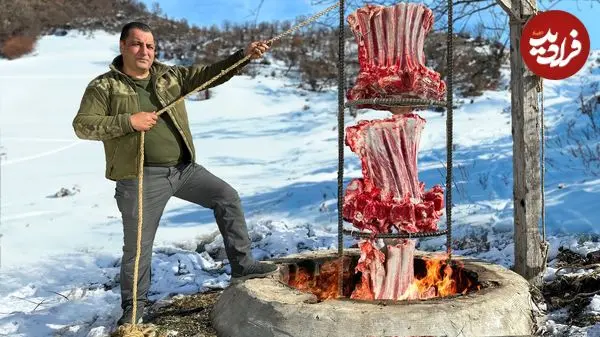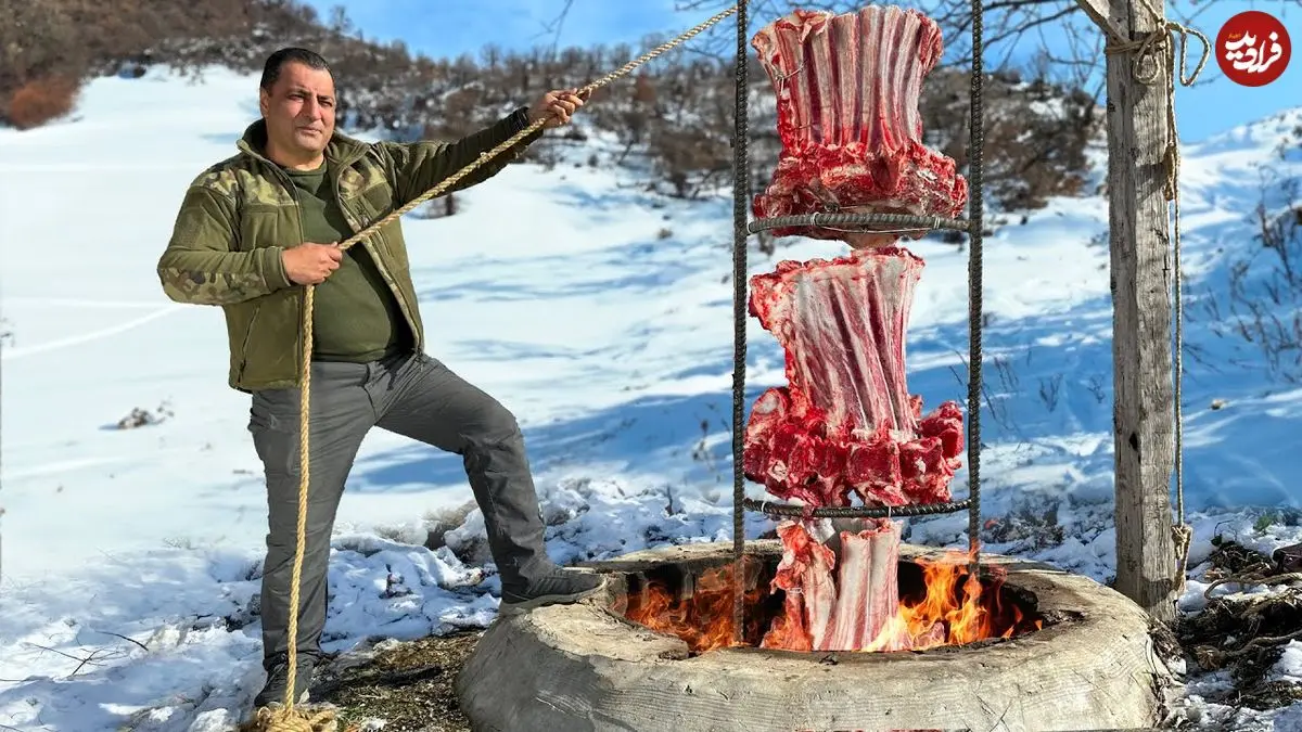 ببینید| غذای روستایی در آذربایجان؛ کباب دنده گاو در تنور و در هوای برفی