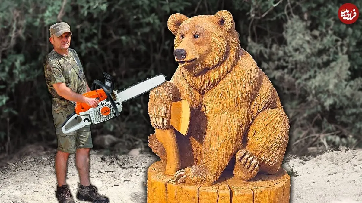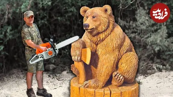 ببینید| ساخت مجسمه چوبی خرس گریزلی در اندازه واقعی با اره برقی به روش نجار اوکراینی
