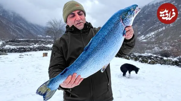ببینید| غذای روستایی در آذربایجان؛ کباب ماهی سالمون با نمک روی آتش در برف
