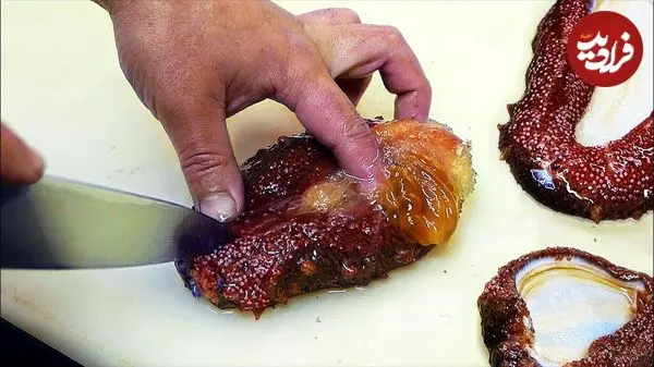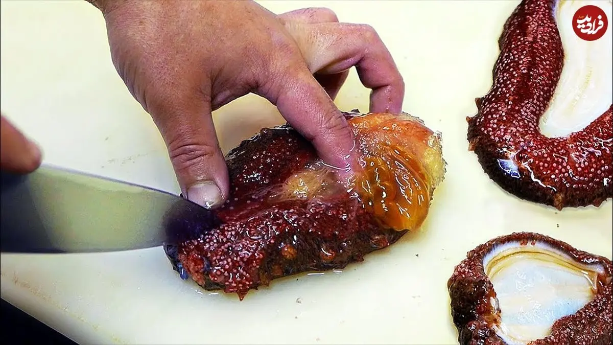 ببینید| غذای خیابانی در ژاپن؛ تهیه دو نوع غذا با خیار دریایی قرمز در توکیو