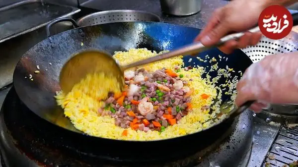 ببینید| غذای خیابانی در آمریکا؛ پخت یک غذای خاص با برنج، میگو، مرغ و بادام هندی در نیویورک