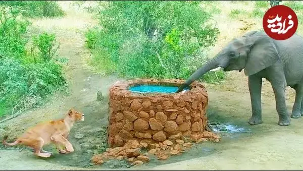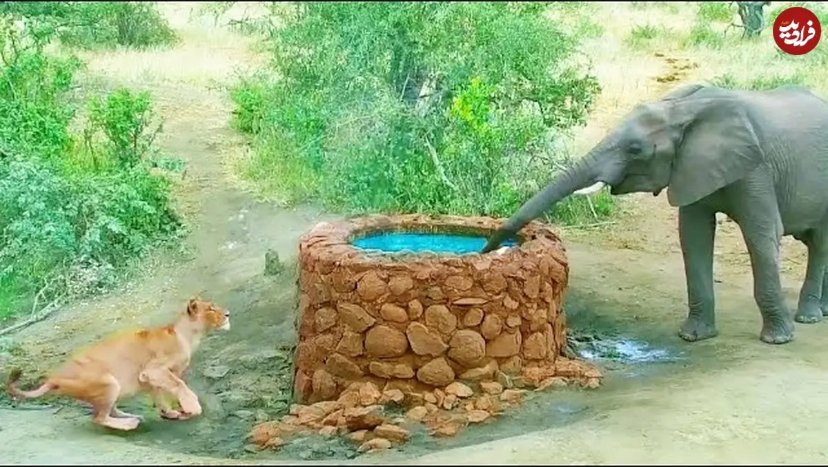 ببینید| وقتی «فیل» از سر ترس روی «شیر» تشنه آب می ریزد!