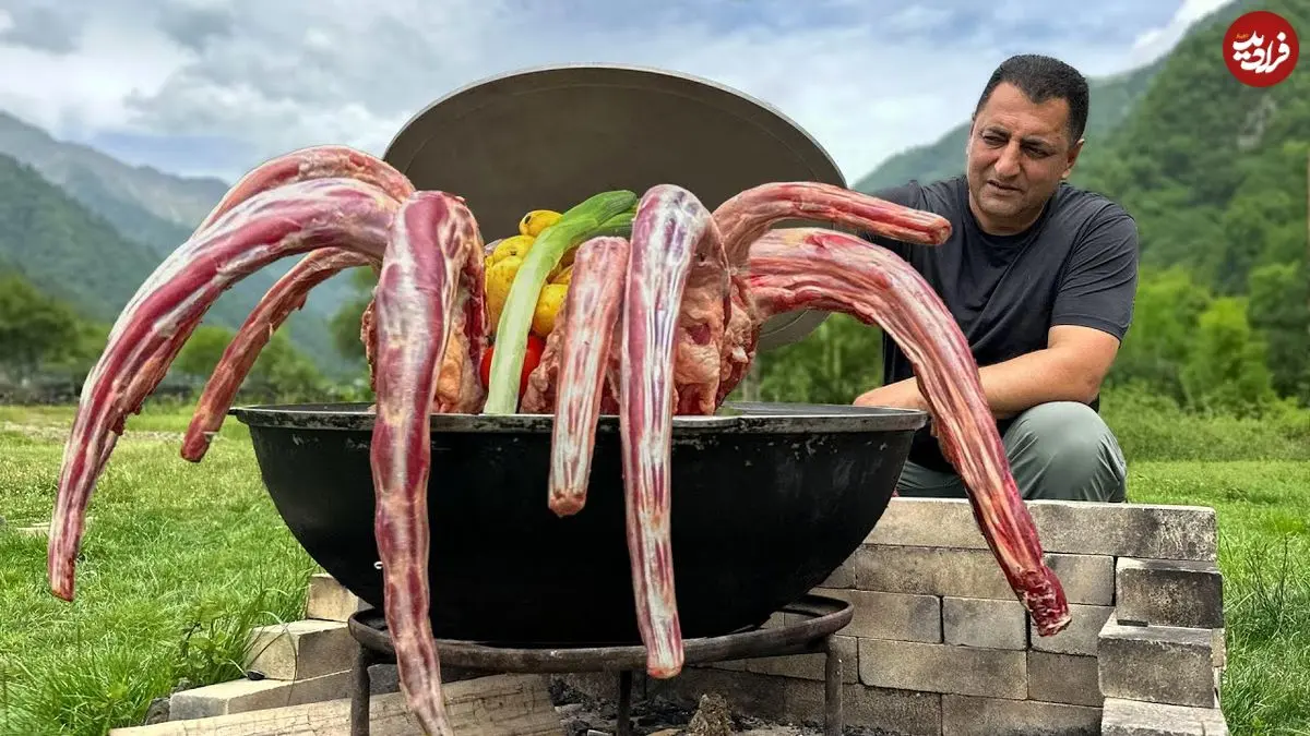 در این ویدئو یک آشپز ماهر ساکن یکی از روستاهای آذربایجان را می بینید که با دم گاو و سبزیجات، یک غذای خاص روی آتش درست می کند.
