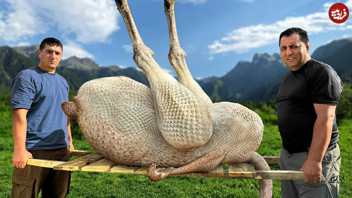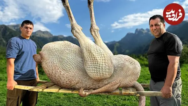 ببینید| غذای روستایی در آذربایجان؛ کباب کردن یک شترمرغ کامل در بشکه
