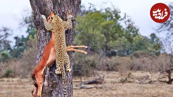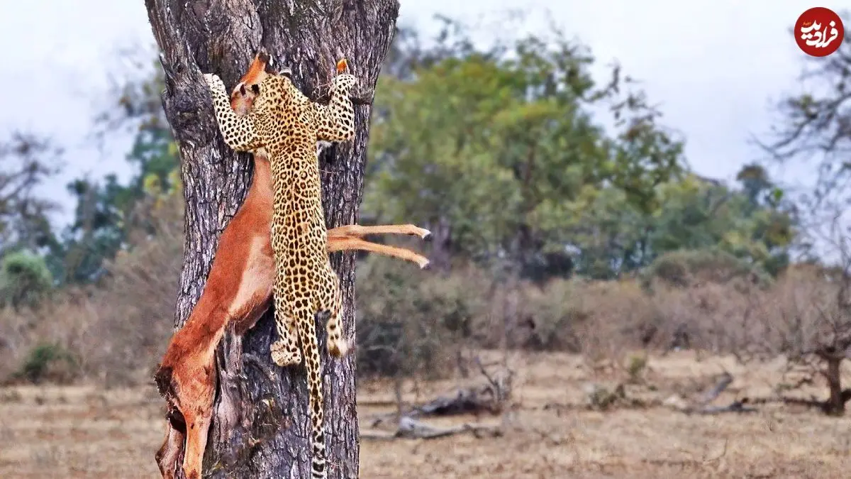 ببینید| تلاش ناموفق پلنگ برای بردن لاشه ایمپالا به بالای درخت