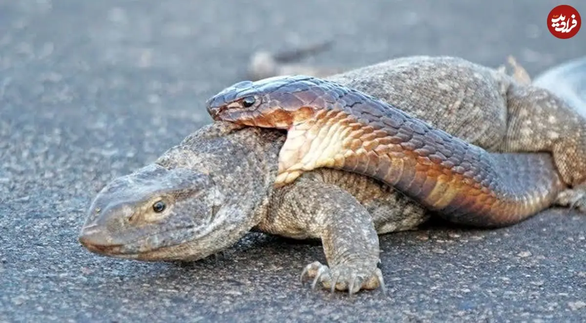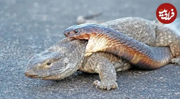 ببینید| تلاش عجیب «مار کبرا» برای شکار «بزمجه» در میان جاده!