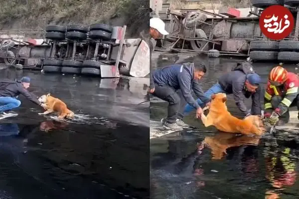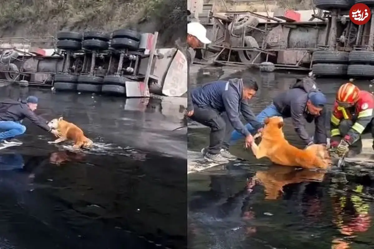 ببینید| نجات یک سگ گرفتار در قیر پس از واژگونی کامیون