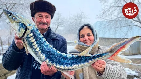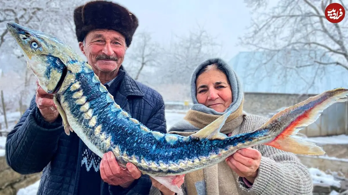 ببینید| غذای روستایی در آذربایجان؛ کباب کردن ماهی خاویاری در هوای برفی