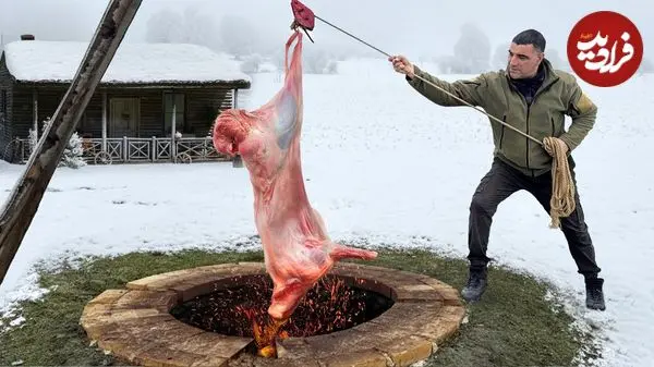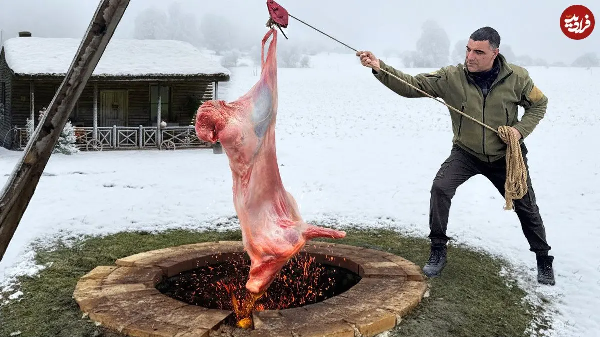 ببینید| غذای روستایی در آذربایجان؛ کباب کردن بره کامل در تنور در هوای برفی