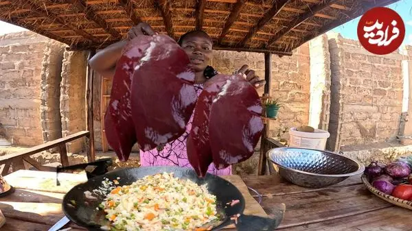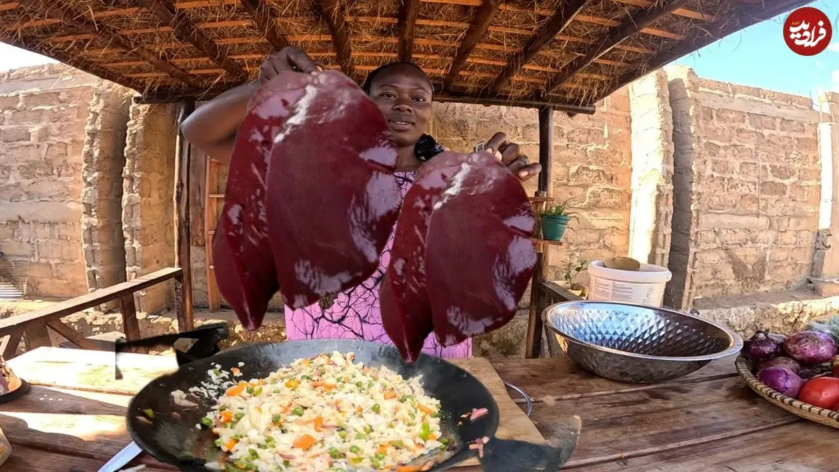ببینید| غذای روستایی در کنیا؛ پخت یک غذای سنتی با جگر، برنج و سبزیجات