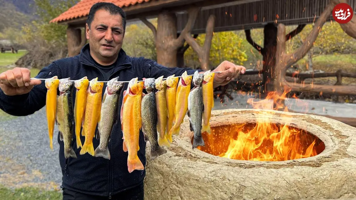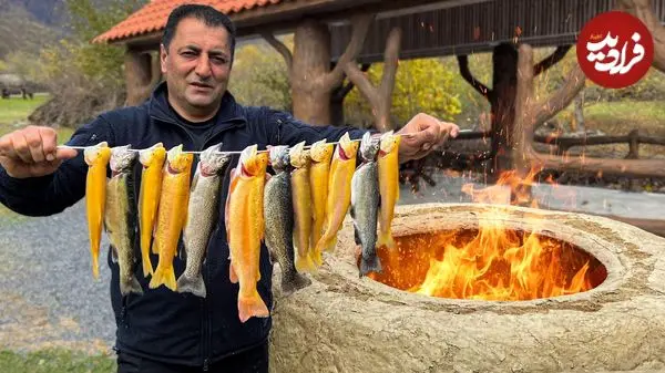 ببینید| غذای روستایی در آذربایجان؛ صید تعدادی ماهی قزل آلا و کباب کردن آنها در تنور