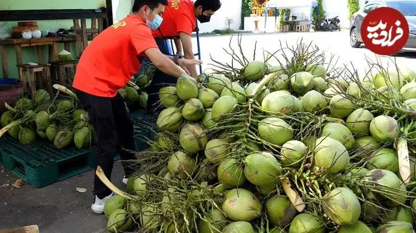 ببینید| غذای خیابانی در تایلند؛ برش نارگیل و تهیه اسموتی با آن در بانکوک