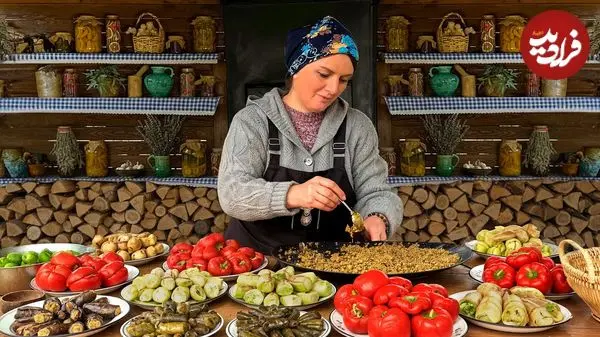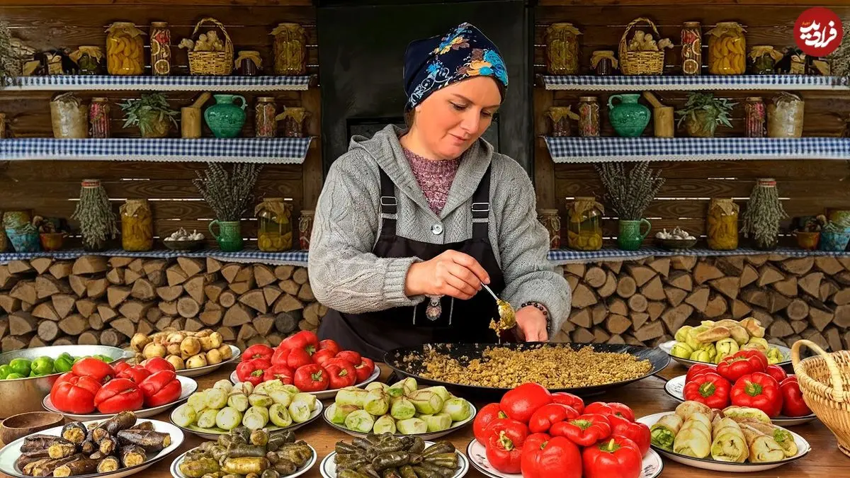 ببینید| غذای روستایی در آذربایجان؛ پخت دلمه سنتی با گوشت چرخ کرده، بادمجان، گوجه فرنگی و فلفل دلمه ای