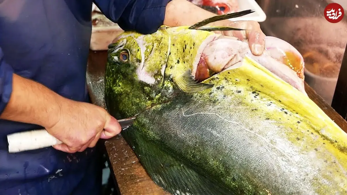 ببینید| غذای خیابانی در ژاپن؛ برش ماهرانه دلفین ماهی و پخت غذا با آن در توکیو