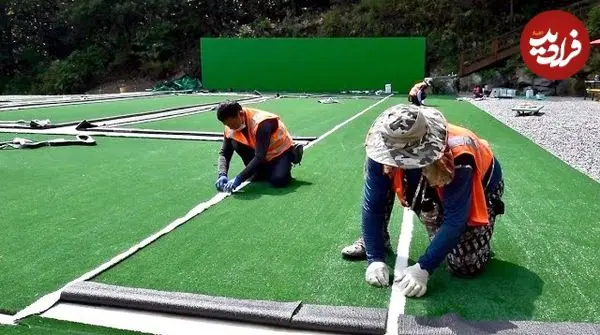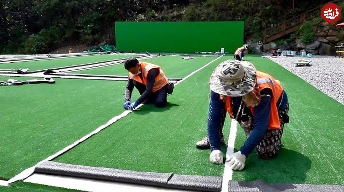 ببینید| مراحل تولید انبوه چمن مصنوعی و فرآیند ساخت زمین تنیس در کره جنوبی