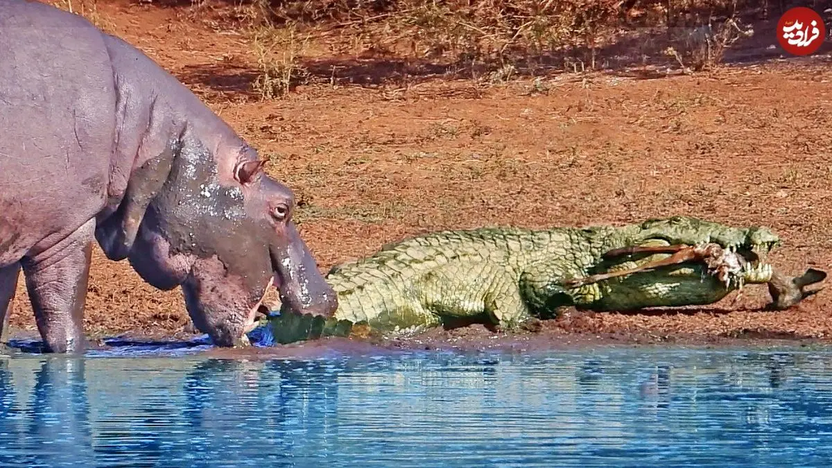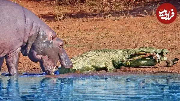 ببینید| گاز گرفتن دم کروکودیل توسط اسب آبی کنجکاو